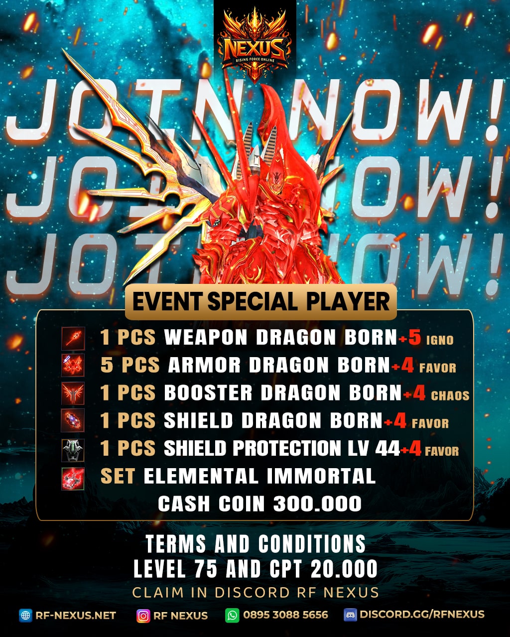 RF Nexus memberikan hadiah sangat spesial untuk player yang kembali ke server Nexus atau bagi kalian yang baru Bergabung di RF Nexus